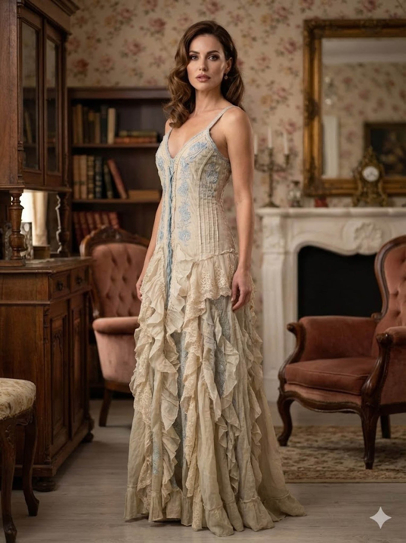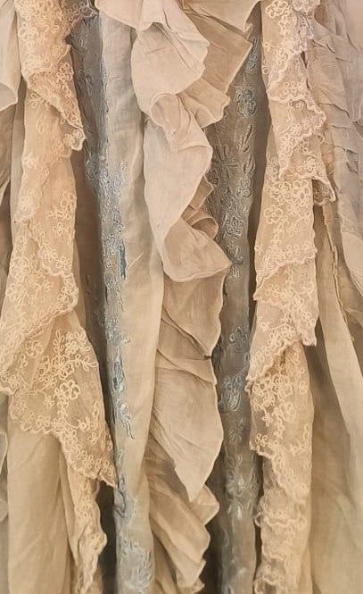 Vestido largo de algodón organdí en tono marfil, con delicados bordados en azul cielo que estilizan la silueta y le dan un aire muy mediterráneo. La caída del tejido y la combinación de volantes crean movimiento en cada paso, con ese punto boho y romántico tan característico de Samsara51.