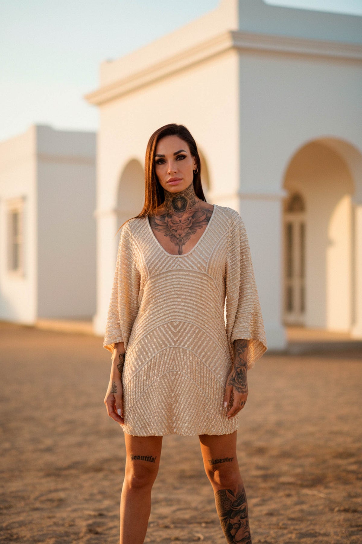 Este vestido de viscosa es un auténtico espectáculo. Confeccionado con mimo, cada bead y lentejuela está colocada a mano por artesanos expertos, creando un brillo sofisticado que acompaña cada movimiento. La viscosa se ajusta al cuerpo sin marcar de más, dibujando una silueta elegante y sensual.