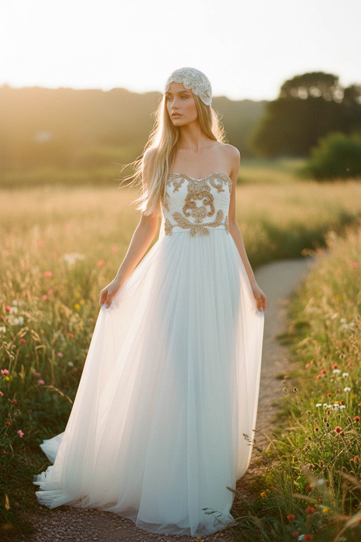 Vestido de novia de inspiración boho-mediterránea, confeccionado en mezcla de algodón, modal y tul ligero. El cuerpo está realzado con bordados dorados en relieve y cristales aplicados a mano, que dibujan un motivo central muy favorecedor sobre el escote corazón. La falda cae con movimiento suave y vaporoso, y se cierra en la espalda con cremallera ajustable, quedando limpio y cómodo.