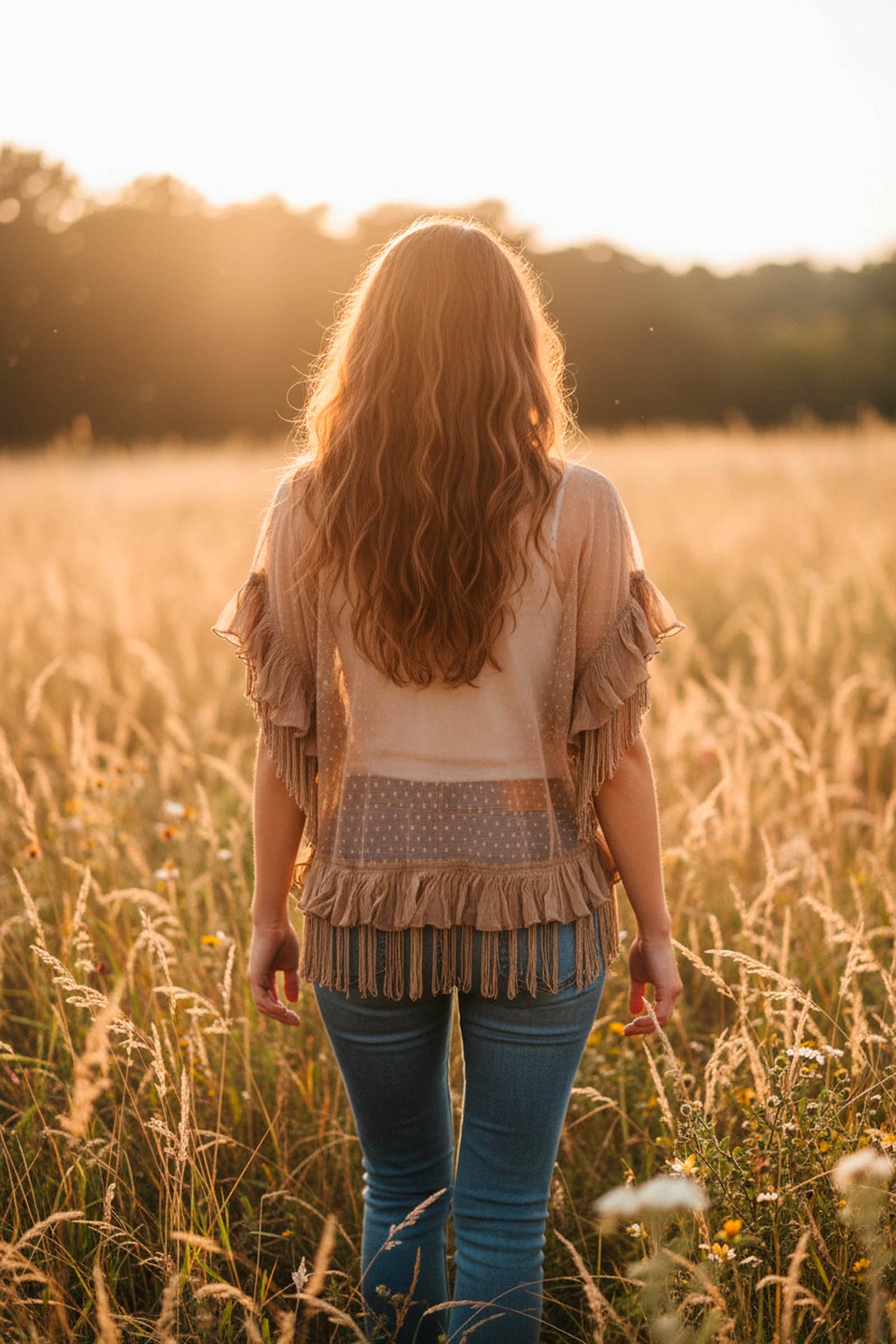 Confeccionada en georgette y tul, esta prenda destaca por sus bordados delicados y lentejuelas cuidadosamente aplicadas a mano. Los flecos añaden movimiento y textura, creando una silueta sofisticada ideal para ocasiones especiales. Un diseño que combina la precisión del trabajo artesanal con la ligereza de los tejidos premium, perfecto para quienes buscan prendas únicas con carácter editorial. Talla única