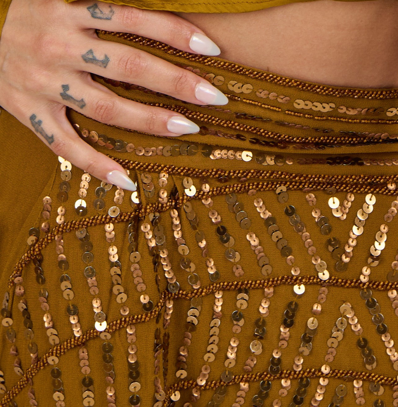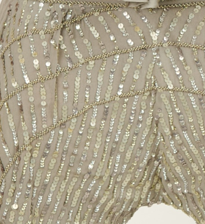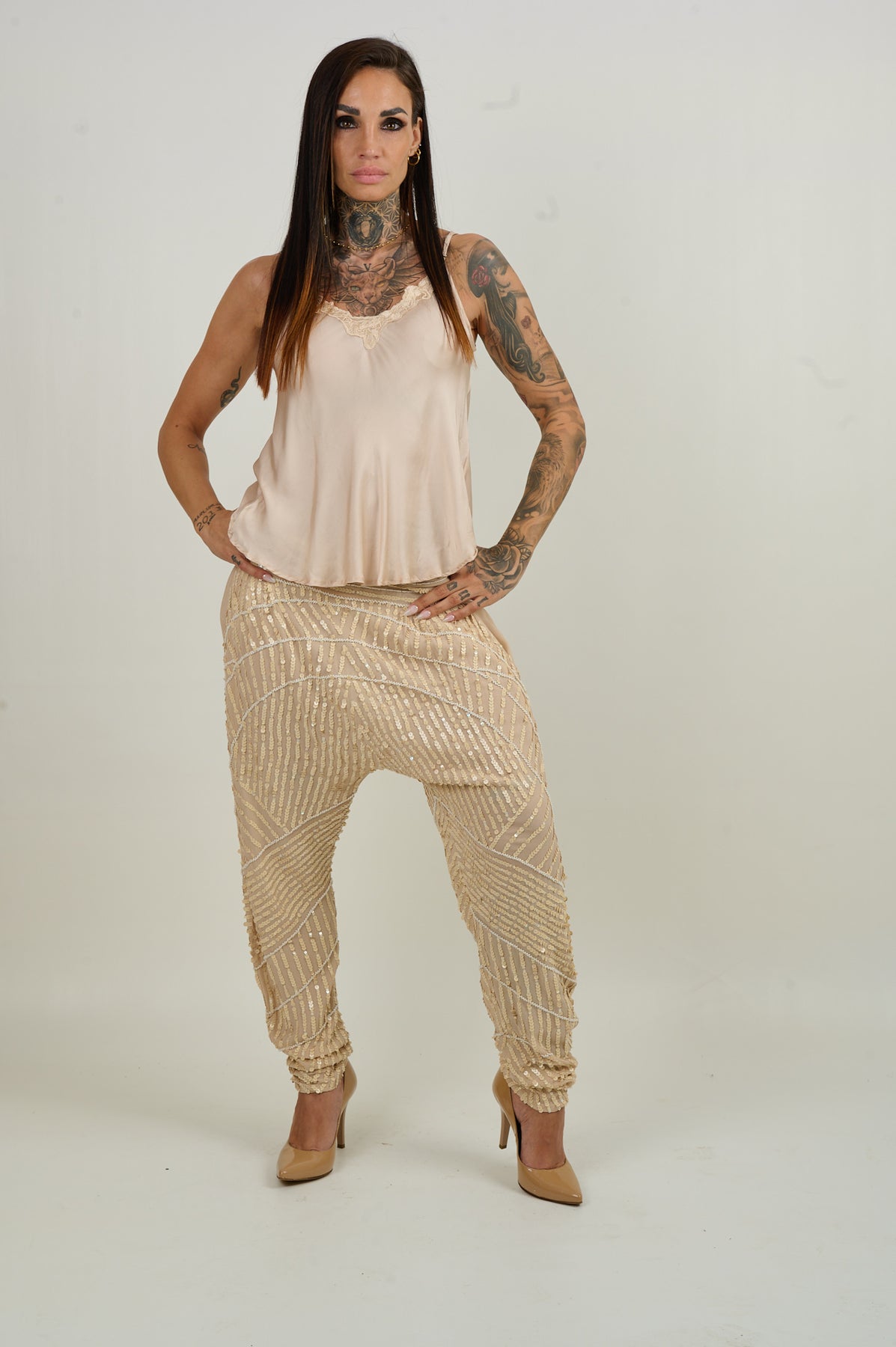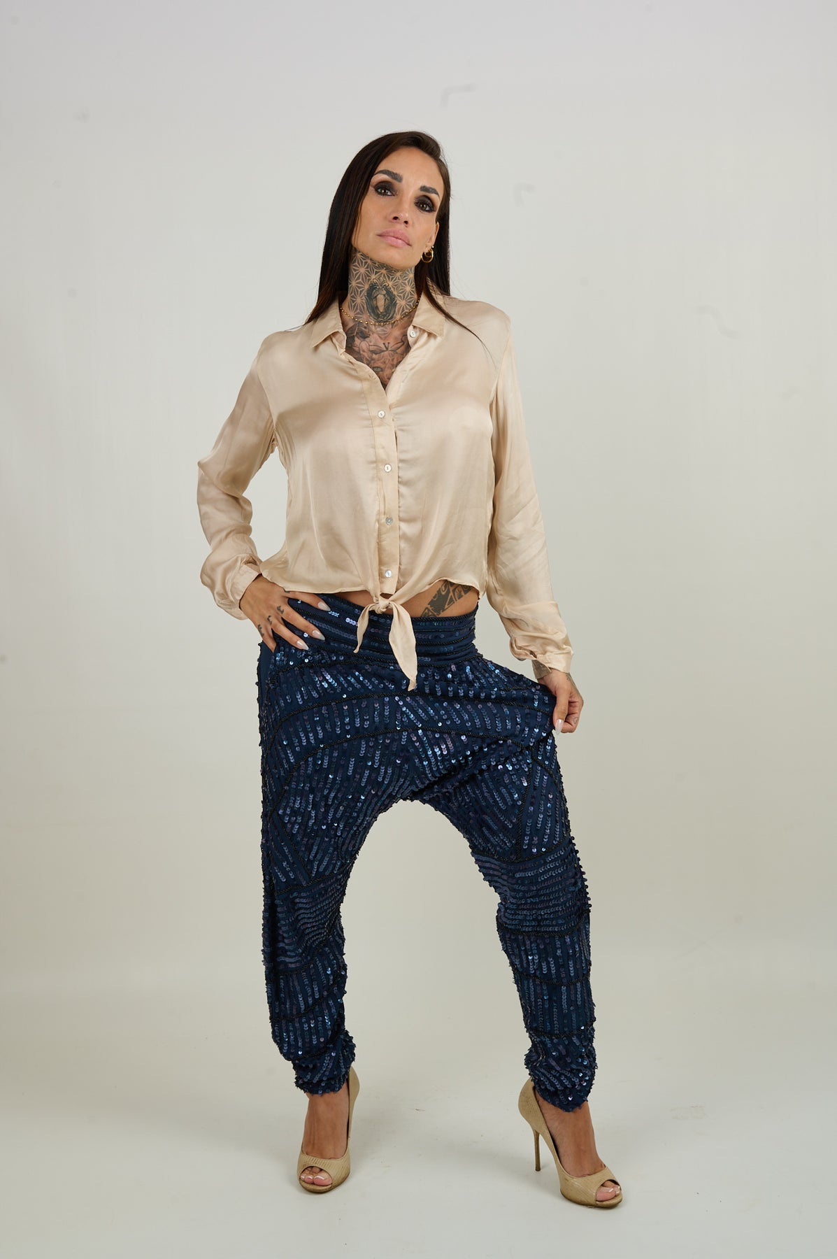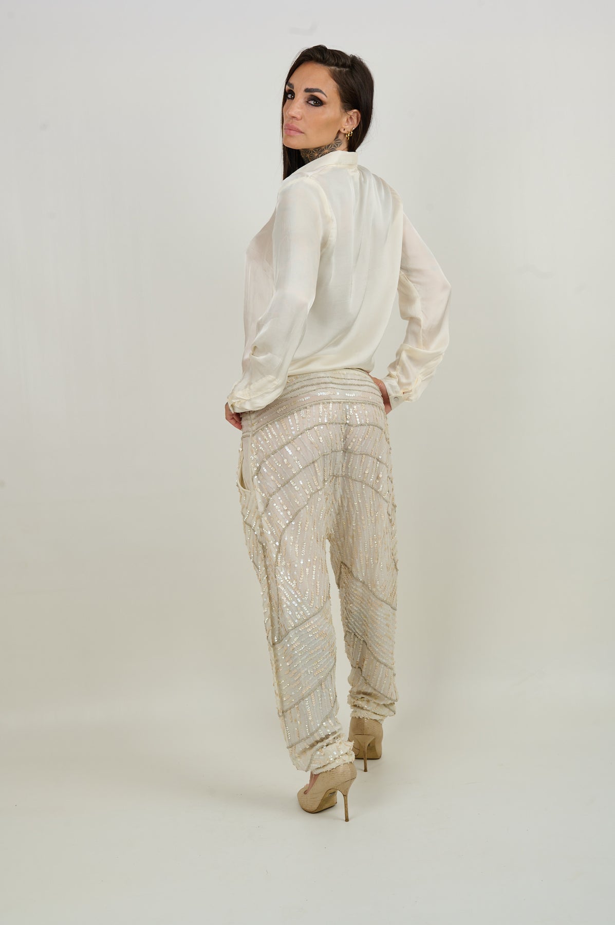 Nuestro pantalón SALOME está confeccionado en georgette  de primera calidad, un tejido que se adapta perfectamente al movimiento femenino. La decoración con lentejuelas y pequeños beads  crea un efecto visual deslumbrante bajo cualquier luz.