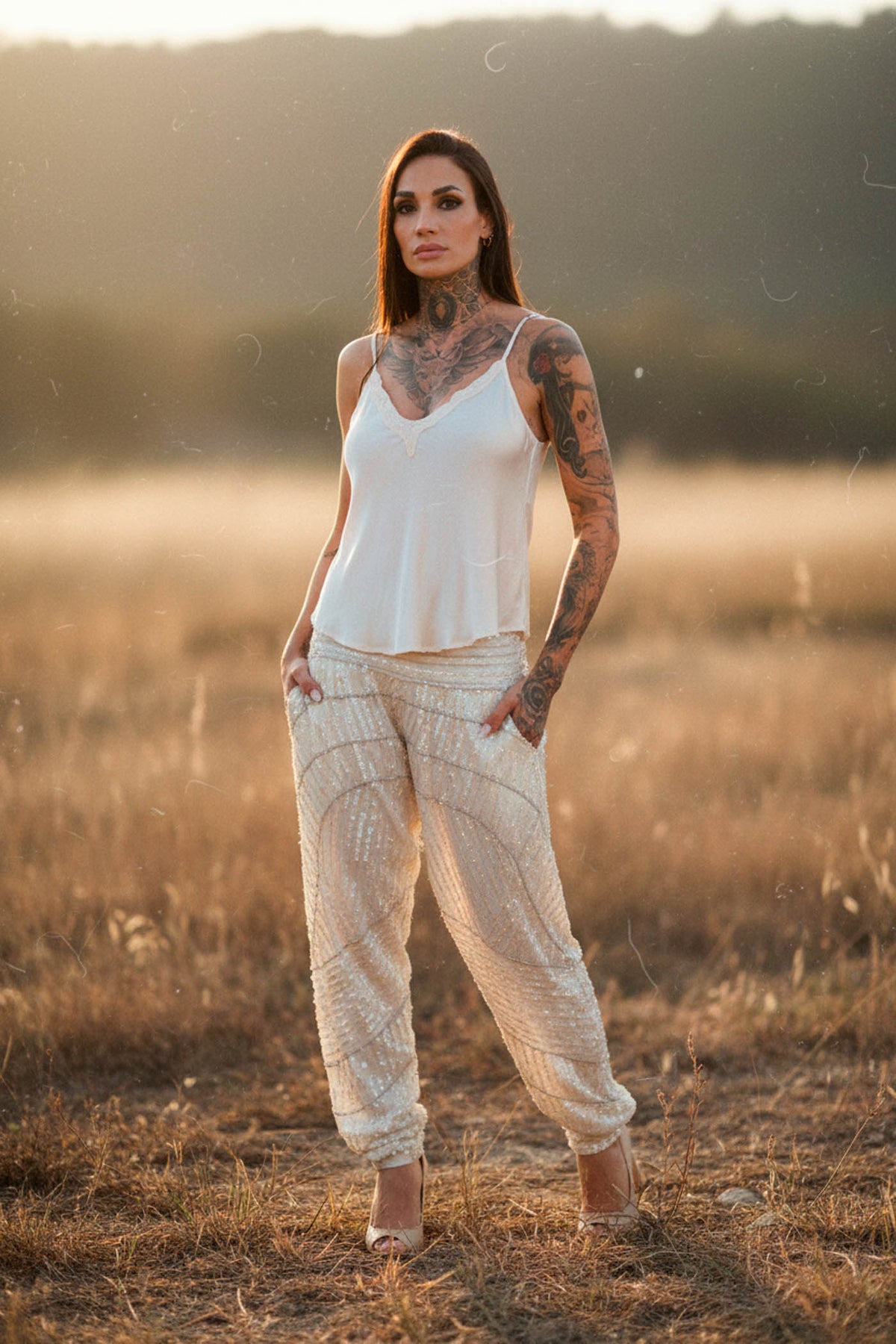 Para mantener la belleza artesanal de tu pantalón, recomendamos lavado en seco profesional. Las lentejuelas y beads mantendrán su brillo original durante años. Aunque permite el lavado a mano perfectamente.
